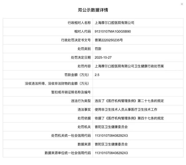 华利财经丨上海摩尔口腔医院非法聘用非医技人员被罚款2.5万元