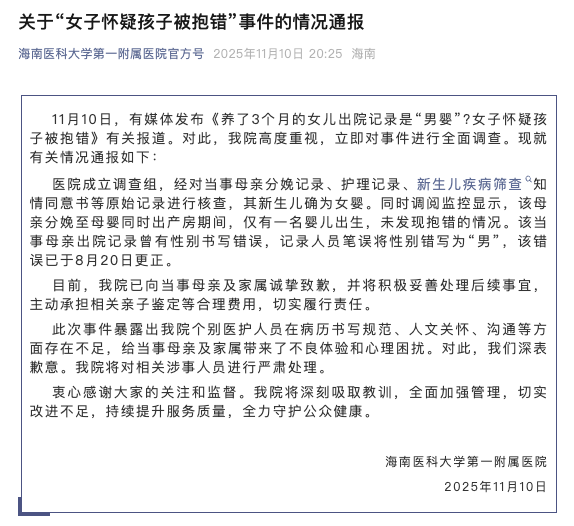 海南医科大学第一附属医院召开新闻发布会:11月10日,有媒体发表报道称:“我3个月大的女儿出院记录是‘男孩’吗?我们怀疑该妇女可能误抱了孩子。”医院成立调查组,查阅了母亲的原始记录,包括出生记录、母乳喂养记录、新生儿医学检查知情同意书等,发现新生儿竟是一名女孩。同时,监测显示,产妇产后产房内仅同时产下一名婴儿,未发现束缚方式不正确的情况。母亲出院记录中输入的性别有误。记录员错误地将性别写为“男”。该漏洞已于8月20日修复。目前,我院向受影响的妈妈及家属致以诚挚的歉意,并将积极妥善解决该问题。事件后果,主动承担相应亲子鉴定费用,坚决履行责任。此次事件暴露了医护人员在个人病历准备、人文关怀、沟通等方面的欠缺,给产妇及其家人带来了负面经历和精神困扰。我们非常抱歉。我院将严肃处理涉案人员。 (海南医科大学第一附属医院)