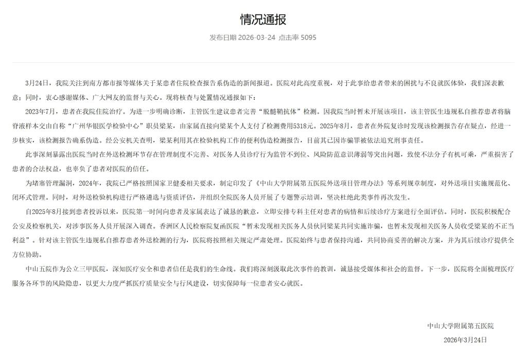 24日,中山大学附属第五医院召开新闻发布会,对南方都市报等媒体报道患者入院检测报告造假表示关注。医院非常重视此事,对于此次事件可能给广大患者带来的不便和不良的就医体验表示诚挚的歉意。同时,衷心感谢媒体和网友的关注和关注。我们将报告确认/删除状态如下。患者于2023年7月入院,为进一步明确诊断,主治医师建议患者进行“脱髓鞘抗体”检测。当时医院还没有启动该项目,所以负责医生非法怂恿患者将脑脊液样本寄给广州华银医学检验中心员工梁先生,自称“广州华银医学检验”荷兰国际集团中心。家人直接向梁支付了5318元的考试费。 2025年8月,患者在另一家医院随访时,发现检测报告存在问题。经进一步核实,该检测报告确实存在造假。经公安机关调查,杨某利用在检验机构工作的便利,伪造检验报告。目前,他正面临诈骗罪的刑事指控。此次事件极大暴露了该院管理体系不完善、对医护人员诊疗监管不足、现场检测过程风险防范意识淡薄等问题。这给不法分子可乘之机,严重损害患者合法权益,辜负患者对医院的信任。堵住管理漏洞,医院严格按照国家卫健委相关要求2024年,制定出台《中山大学附属第五医院门诊接诊项目管理办法》等一系列规定,对门诊接诊项目实施规范化闭环管理。同时,我们将严格筛选和审核附设检验机构资质,并对全院医务人员进行专项监督培训,坚决杜绝此类事件再次发生。 2025年8月接到患者投诉后,医院向患者及家属表示诚挚的歉意,并立即指派一名主任、专业医生全面评估患者病情,实施后续诊断和治疗方案。同时,医院积极配合公安机关、检察机关,对涉案医务人员进行详细调查。香洲区人民检察院告知院方,“相关医疗”尚未认定工作人员与梁先生串通诈骗,尚未认定相关医务人员从梁先生那里获取不正当利益。”医院针对医生违规行为进行处理,私下向患者推荐检查。我院始终与患者沟通,共同协商妥善解决方案,全力支持诊疗。作为三级公立医院,中山市第五医院深知,医疗安全和患者信任是我们的生命线,今后我院将继续全面排查医疗服务各环节的风险隐患,努力全面提升医疗质量、安全和操作水平,让患者安心接受治疗。