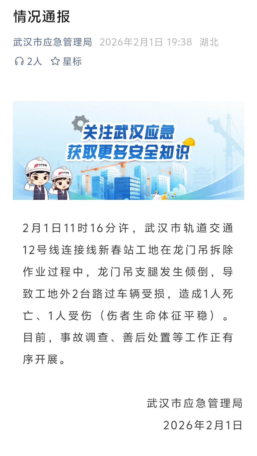 海报新闻记者温鲁一武汉报道。 2月1日,武汉市后湖大街一辆龙门吊翻车,与过往车辆相撞。市应急管理办公室通报称,事故造成1人死亡、1人受伤。现场视频显示,事发地点位于武汉市江岸区后湖街一处地铁施工工地旁。建筑工地上的一台龙门吊突然倾斜,与附近高速公路上行驶的一辆白色客车相撞。车辆后座严重受损。晚上 7:00 左右今天,武汉市应急办发布情况通报。 2月1日11时16分左右,武汉铁路12号线联络线新春站施工现场一台龙门吊进行拆除作业时,龙门吊稳定器翻倒,导致工地外行驶的两辆车受损,造成1人死亡、1人受伤。另一人(伤者生命体征如下)。稳定的)。目前,事故调查和监测工作进展顺利。如果您能为我们提供新的建议,我们将不胜感激。一旦通过,我们将及时发布公告。海报新闻报道热线:010-64004224,微信报道:HaibaoNewsSw。