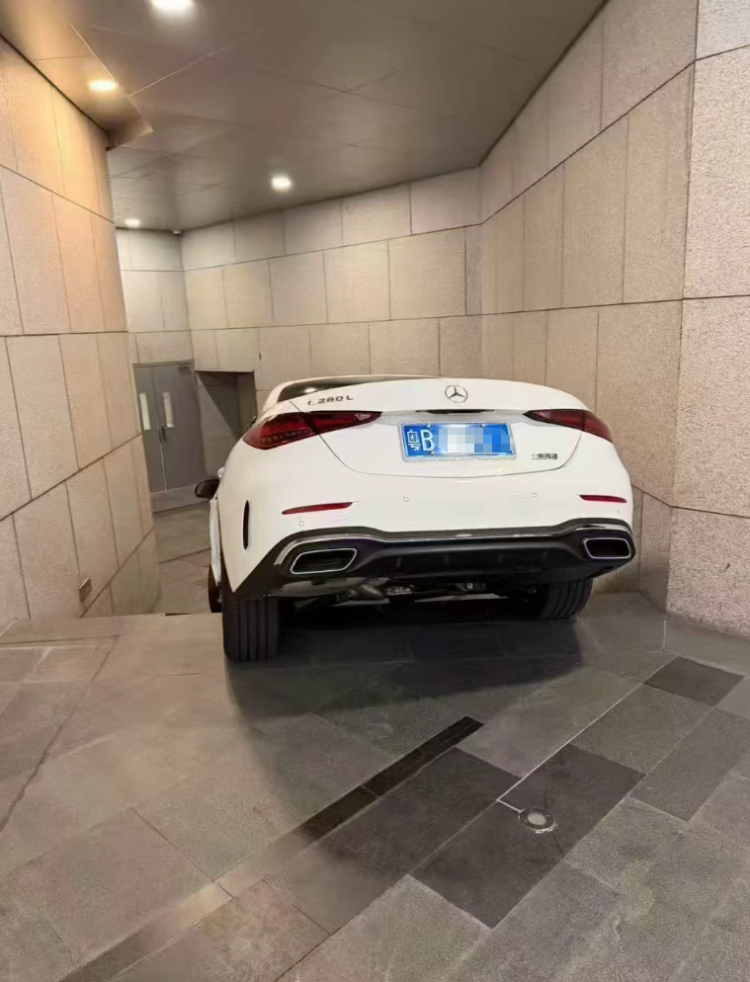 深圳一辆汽车不慎冲入人行道,从楼梯上摔下,被困。商场回应称:“案发现场已放置一个花盆。”