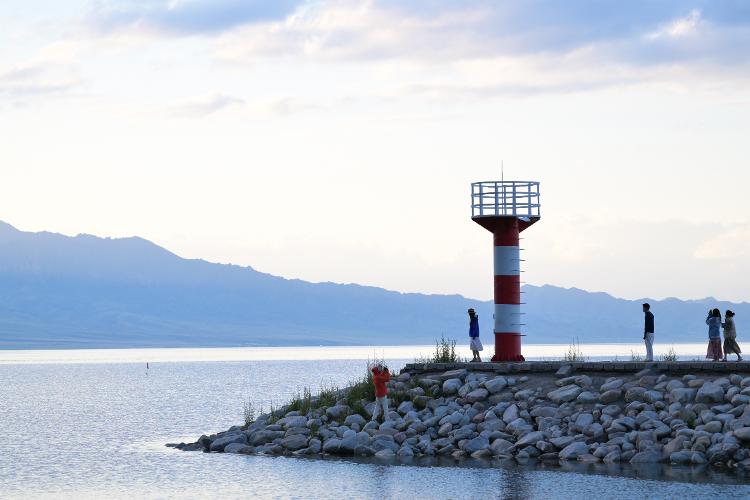 ↑游客参观并在Sailimu湖海岸上拍照(照片9月)。